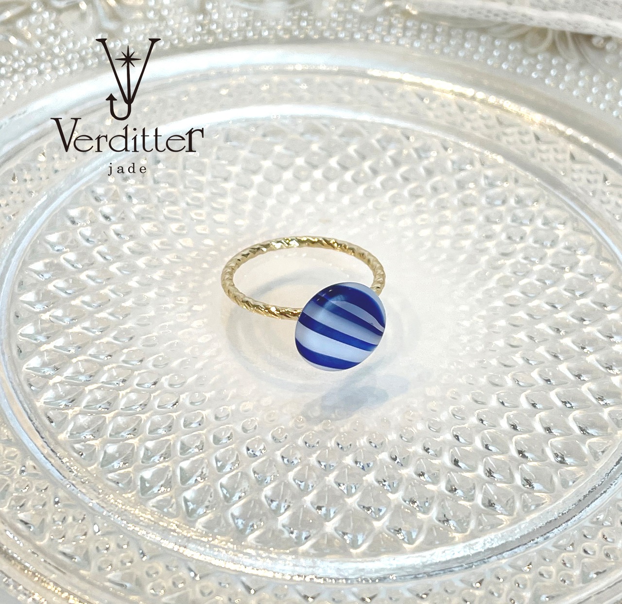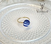 このブルーストライプリングは、独特なストライプ模様と1点物であるドイツ製ヴィンテージボタンガラスが融合したデザインで、あなたの指先をエレガントに飾るアイテムです。美しいストライプの色彩が、シンプルでありながらも華やかな存在感を放ち、日常使いはもちろん特別なシーンでも映えること間違いなしです。